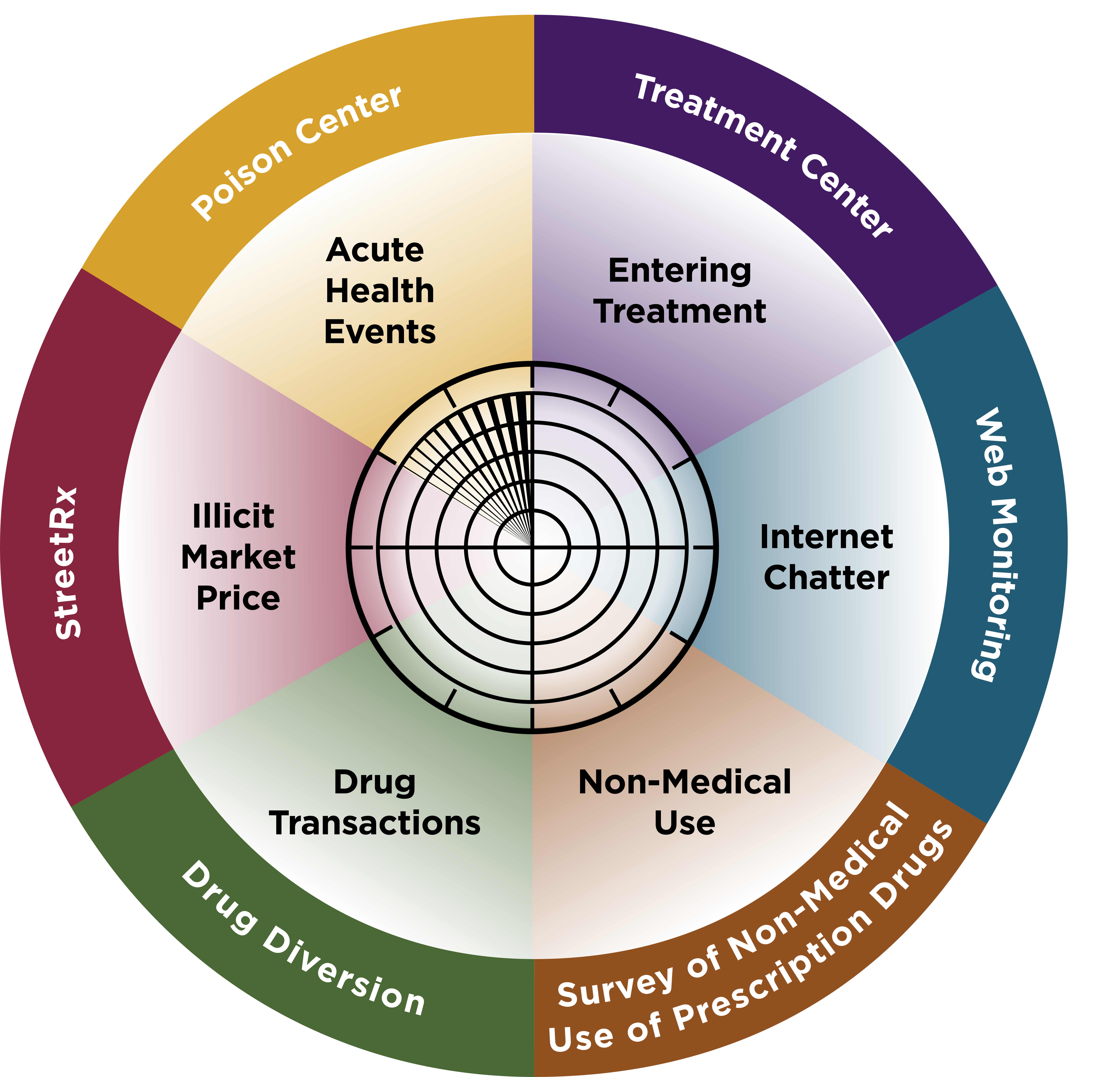 The RADARS System utilizes a mosaic strategy to monitor abuse, misuse and diversion across all phases of the drug abuse pathway.